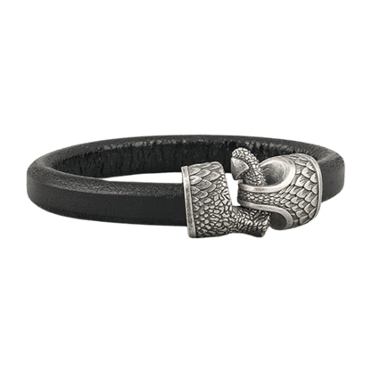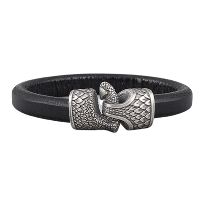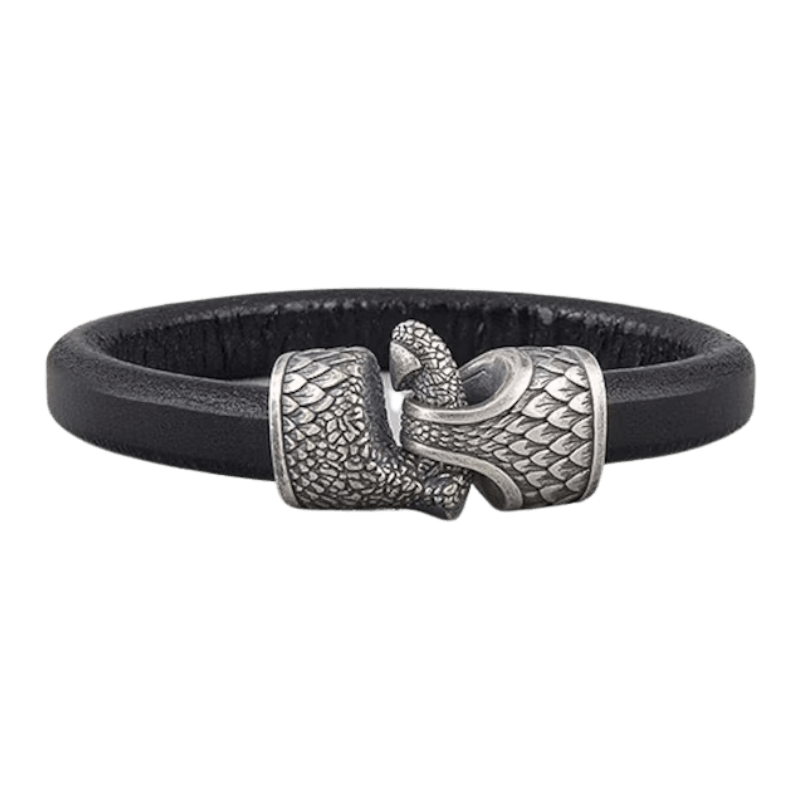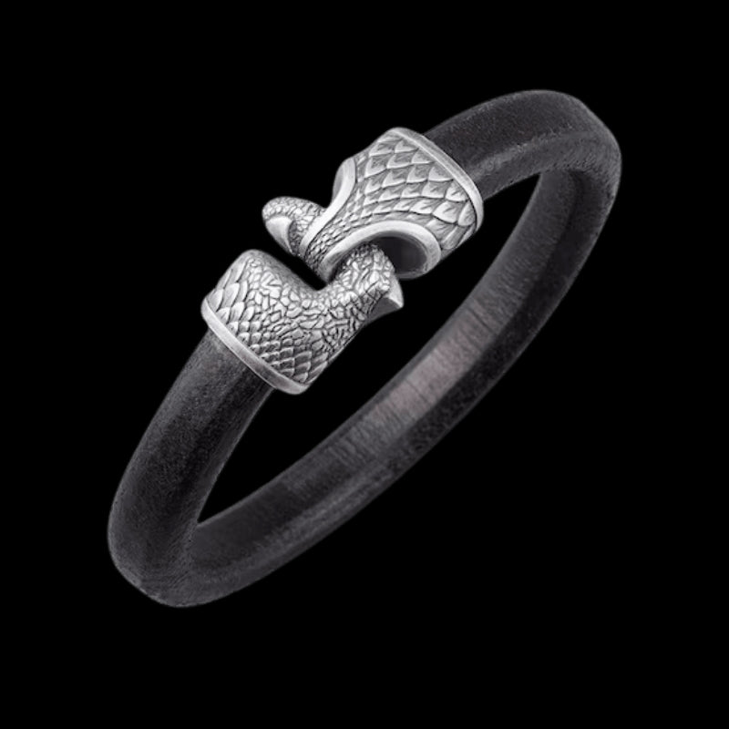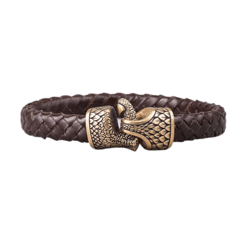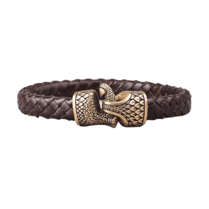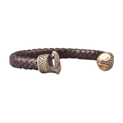 Esta pulsera de cuero trenzado hecha a mano es un tributo a los legendarios dragones de la mitología nórdica, seres de inmenso poder, sabiduría y destrucción.