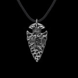 La punta de lanza de este impresionante colgante está decorada con un bastón rúnico mágico conocido como Señalizar.