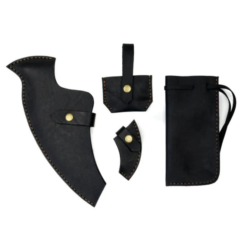Los detallados grabados azules no son solo ornamentales, sino que evocan la mítica escarcha y el poder imbuidos en cada golpe. Combinado con el mango de madera de fresno tallado, envuelto en cuero flexible, el hacha lleva tanto brutalidad como precisión en igual medida.