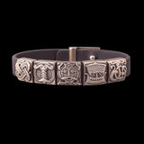 Viking-style sturdy leather bracelet decorated with plates in bronze or silver embossed with images from Norse mythology and Viking culture.