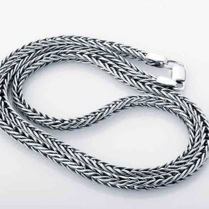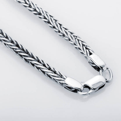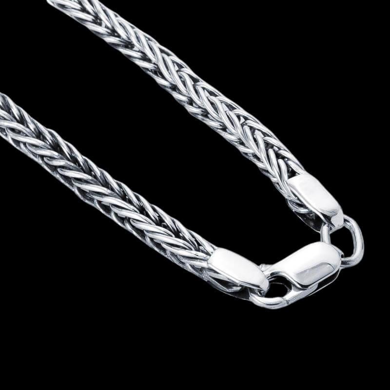 La intrincada trenza de la cadena de trigo es una metáfora del complejo tejido de la vida, un diseño emblemático apreciado en la cultura nórdica. Elaborada por manos expertas, esta cadena de plata esterlina encarna la resistencia y la interconexión de todas las cosas, un principio fundamental en el sistema de creencias vikingo.