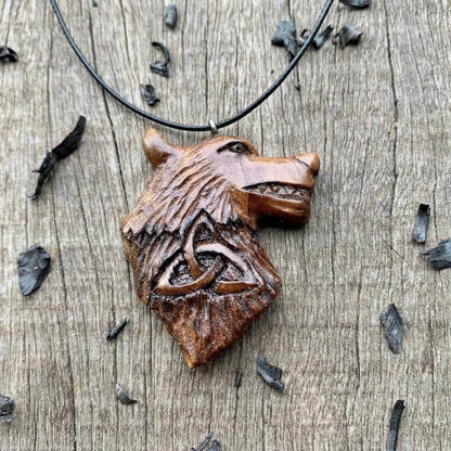 Colgante de cabeza de lobo y triquetra de madera de nogal único tallado a mano