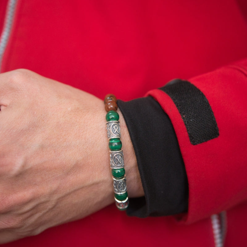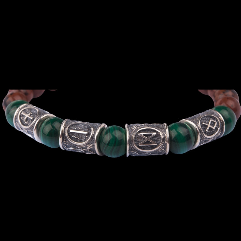 Pulsera Vikinga con Malaquita y Obsidiana Roja, Runas de Odín grabadas