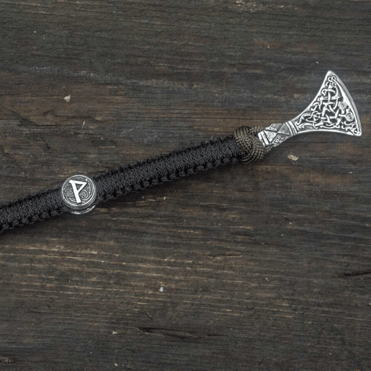 Kaikissa paracord-rannekoruissamme on joko a Thorin vasara ja Viikinkikirves koukku ja silmälukko.