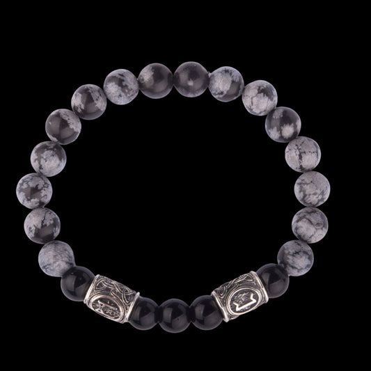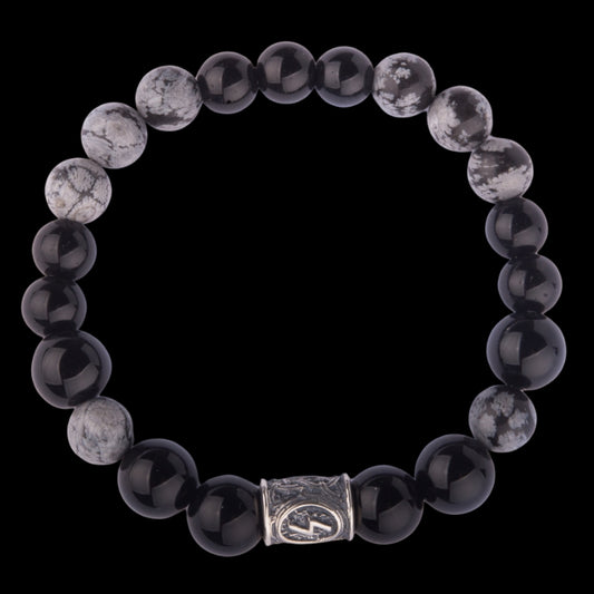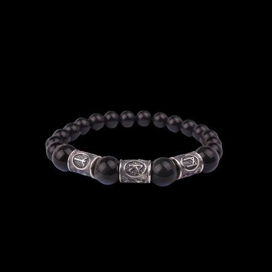 Viking-rannekoru mustaa akaattia ja harmaata obsidiaania riimuhelmillä