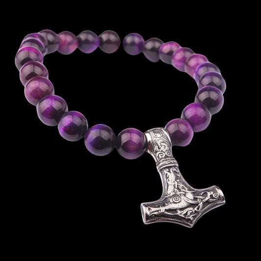 Käsintehty Viking-rannekoru purppuraisessa kissansilmässä Mjolnirin kanssa