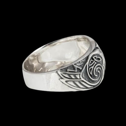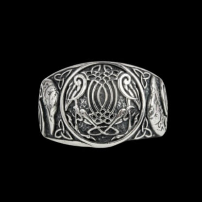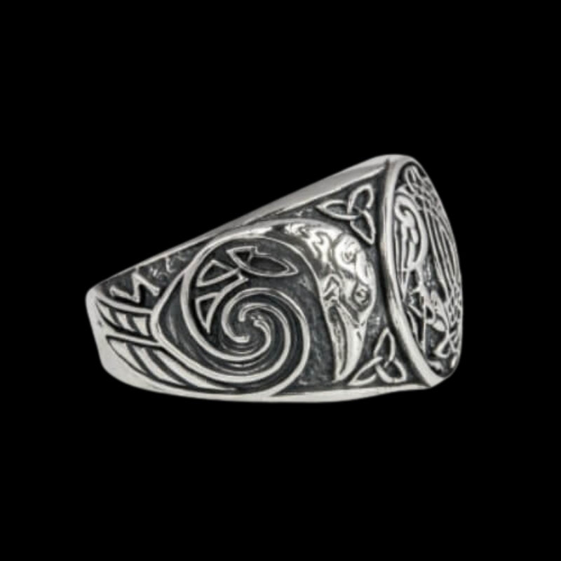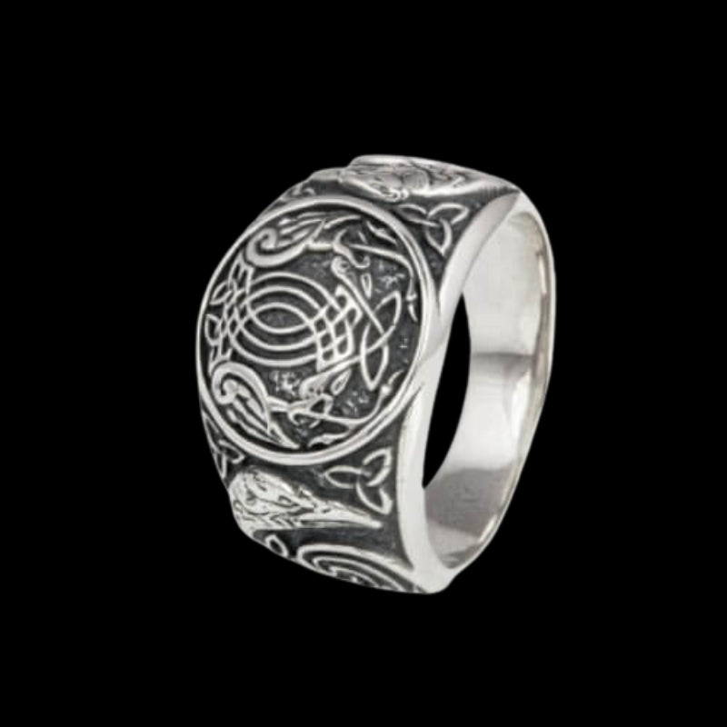 Tämä sterlinghopeasormus vangitsee Odinin korppien olemuksen hämmästyttävän yksityiskohtaisesti. Huginn ja Muninn on taidokkaasti renderoitu sinetissä ja nauhassa, joten sormus on norjalaisen käsityötaidon mestarikurssi. Se kunnioittaa perinteisiä viikinkien taidetyylejä, joissa näiden mystisten lintujen pitkänomaiset muodot kutovat kiehtovia kuvioita. Tämä kappale ei ole vain sormus; se on viisauden, muistin ja ikuisen tiedon etsimisen symboli, mikä tekee siitä ihanteellisen talismanin niille, jotka arvostavat näitä hyveitä.