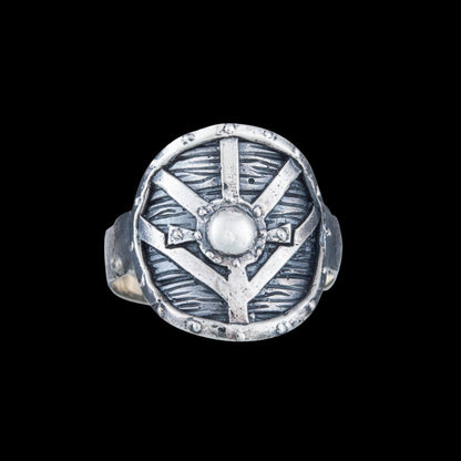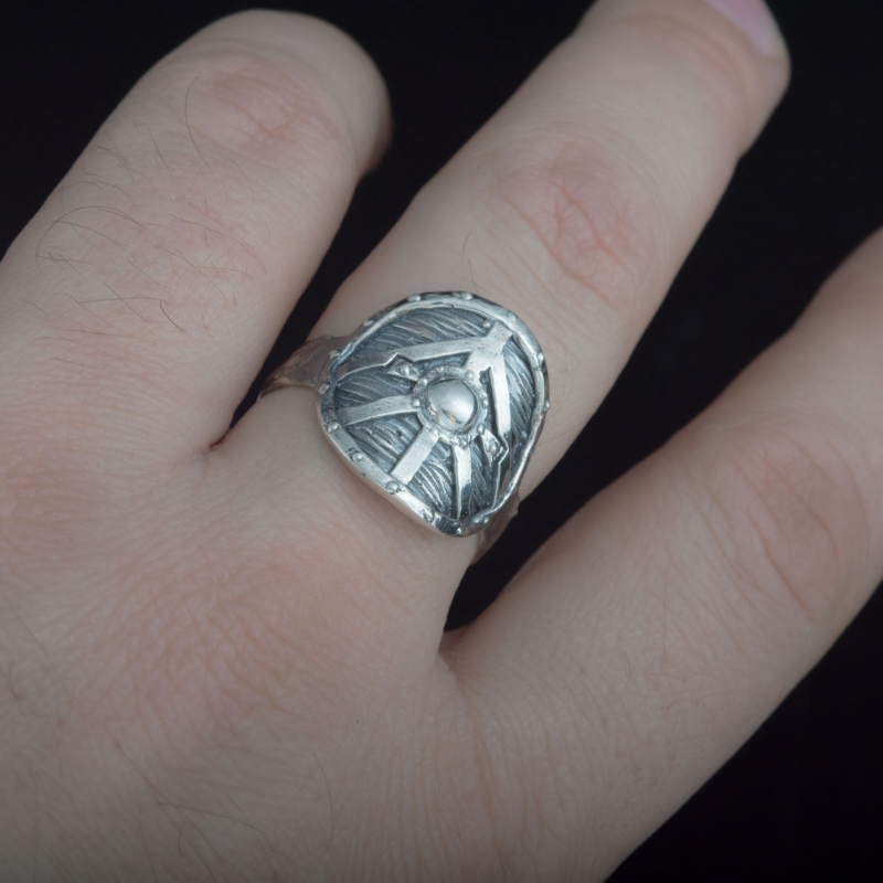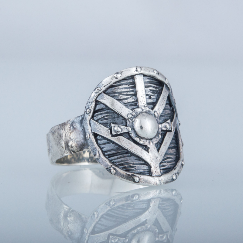 Viikinkiaika oli aikakausi, jolloin urheutta taistelukentällä ei rajoittunut sukupuoli, ja kilpineitoina tunnetut naiset seisoivat korkeina taistelun keskellä. Tämä sterling hopea sormus, jonka muotoilu heijastelee entisiä tukevia pyöreitä kilpiä, on kunnianosoitus niille mahtaville naissotureille.