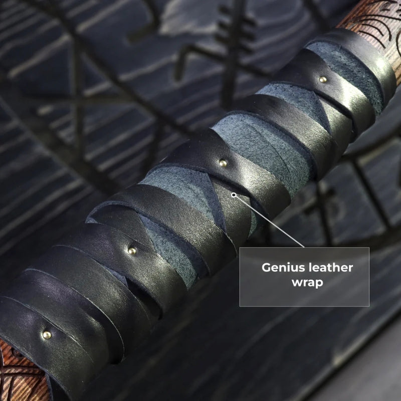 Enemmän kuin pelkkä kopio, tämä kirves on tukeva ja aito varuste. Sen saarnipuukahva, joka on hellästi kääritty nahkaan, varmistaa tukevan otteen, mikä tekee siitä ihanteellisen sekä esittelyyn että käytännölliseen käyttöön. Tämän kirveen omistaminen on kuin viikinki- ja pelihistoriaa käsissäsi.