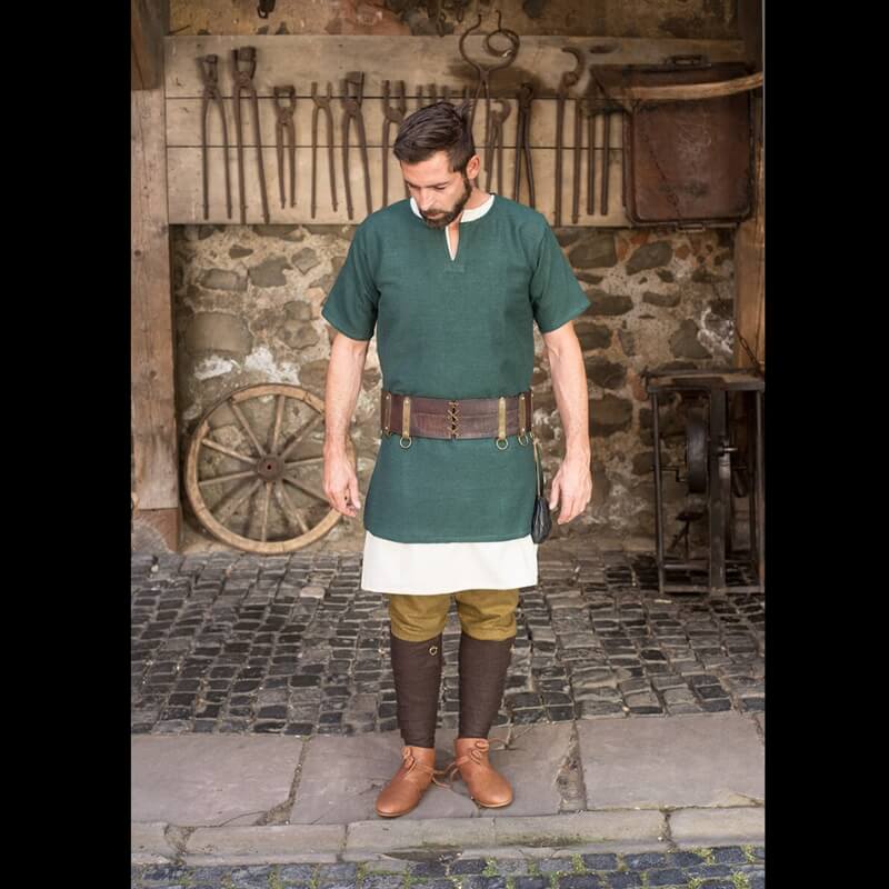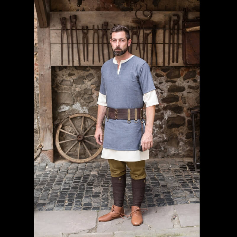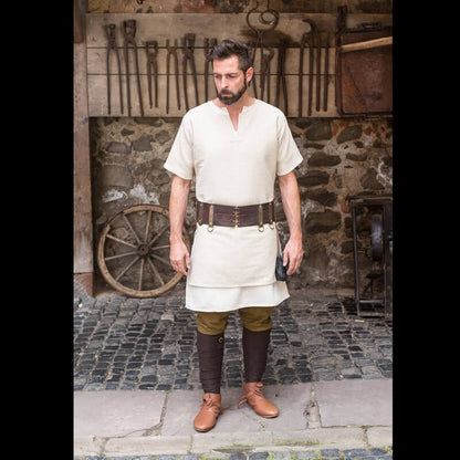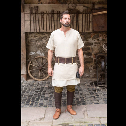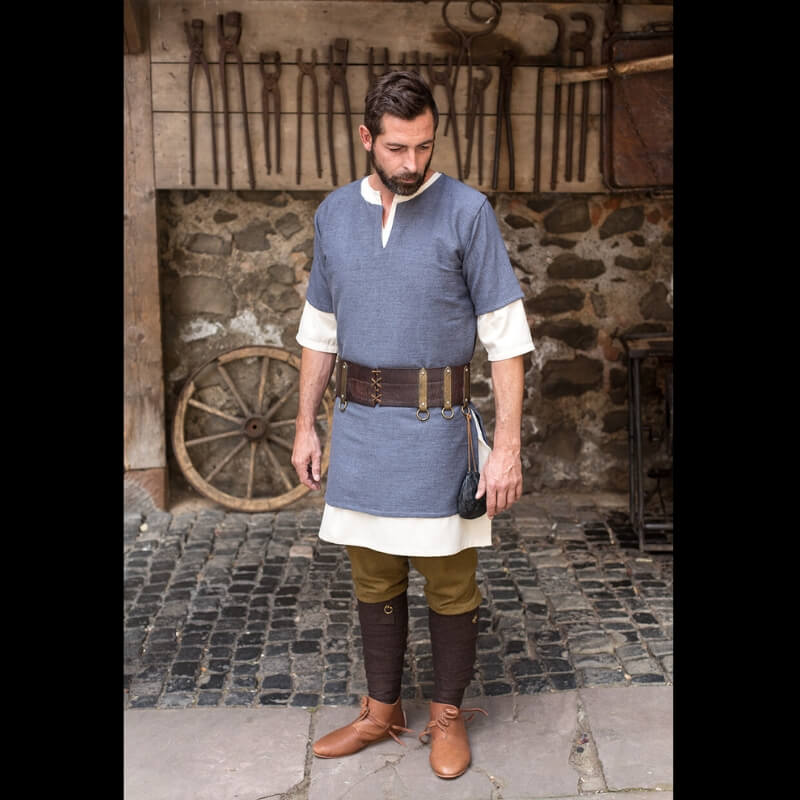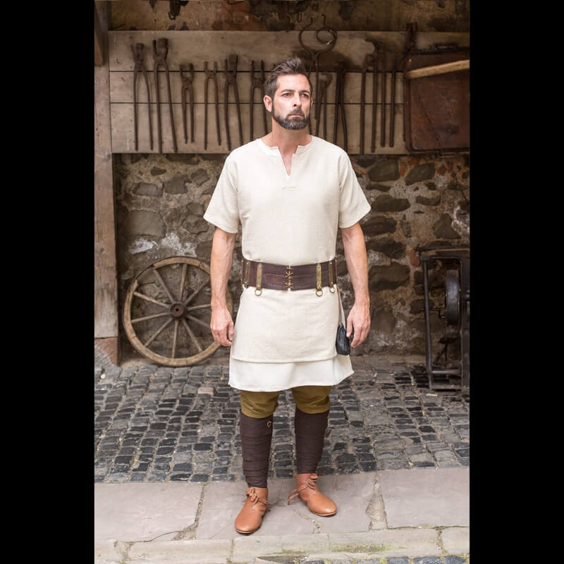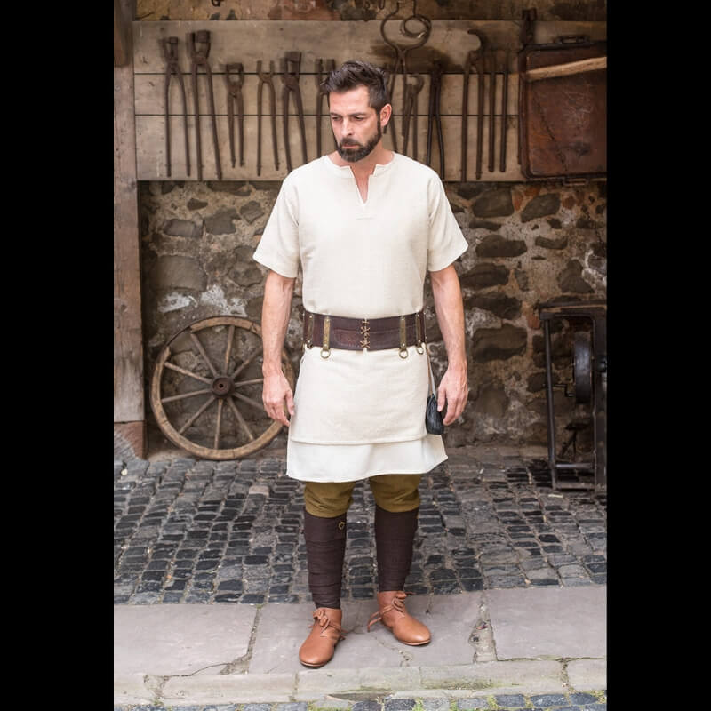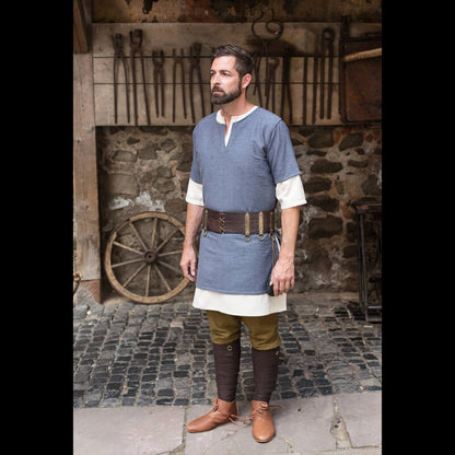 Lyhythihainen Aegir-tunika ylittää perinteiset muotirajat riippumatta siitä, yhdistetäänkö se housujen kanssa historiallisesti inspiroituun ilmeeseen tai käytetään ilmeenä. Sen karkeakuvioitu kangas ja yksinkertainen muotoilu kutsuvat käyttäjiä sisällyttämään palan historiaa päivittäiseen vaatekaappiinsa yhdistäen historiallisen aitouden moderniin tyyliin.