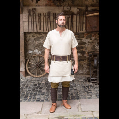Lyhythihainen tunika Aegir on moderni kunnianosoitus pohjoismaisen kulttuurin ja ajattoman muodin kestävälle perinnölle. Tämä karkeakudotusta puuvillasta valmistettu vaate tarjoaa sekä kestävyyden että tuntoelämyksen, joka muistuttaa muinaisia ​​tekstiilejä.