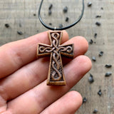 Tässä pähkinäpuusta tehdyssä ristiriipuksessa on monimutkaisia kelttiläisiä solmukuvioita, jotka ovat saaneet inspiraationsa viikinkitaiteellisuudesta ja käsityöstä.