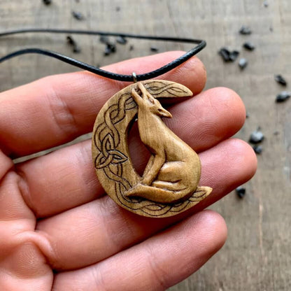 Käsin veistetty ainutlaatuinen pähkinäpuusta kelttiläinen susi kuussa Triquetra-riipustyylillä 1