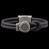 Ce bracelet, avec son élégant cordon en cuir noir et son ornement Valknut en bronze plaqué argent, incarne l'essence de la bravoure et de la croyance viking.
