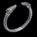Cette superbe bague de bras en argent sterling, fabriquée dans un style nordique classique, présente deux têtes de loup.