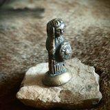 Cette miniature en bronze est considérée comme une représentation visuelle rare d'une femme aux cheveux longs attachés en queue de cheval, portant une longue robe ou un tablier, avec un bouclier sur le bras gauche et une épée dans la main droite.