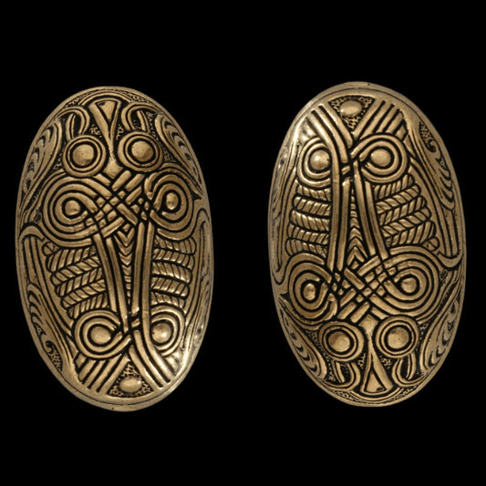Elles sont décorées de motifs géométriques qui semblent abstraits, mais qui font probablement référence à Odin. En observant la broche, on peut voir le masque d'un guerrier. Cette symbolique abstraite est souvent utilisée pour représenter Odin, le dieu de la guerre. Certains motifs géométriques ressemblent également à des plumes, ce qui fait ressembler la broche au dos d'un oiseau, plus précisément à un corbeau, l'oiseau sacré d'Odin.