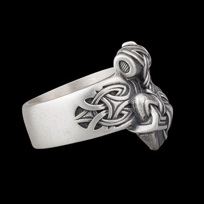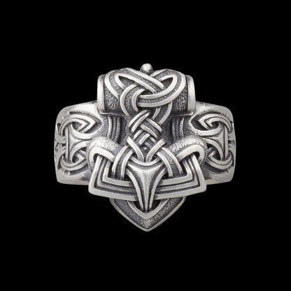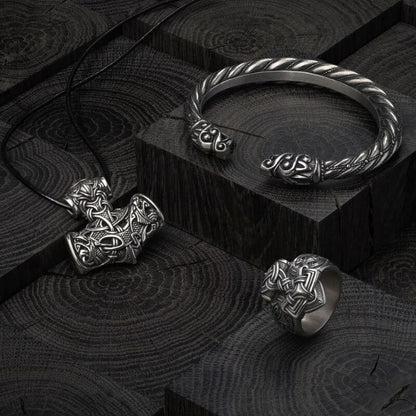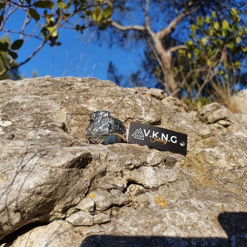 Gravée au marteau au milieu d'un entrelacs nordique, la bague est un clin d'œil subtil mais puissant aux anciens guerriers qui recherchaient la faveur du dieu du tonnerre.
