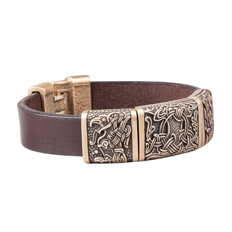 • Bracelet viking en cuir italien avec plaques décoratives en bronze ou en argent
