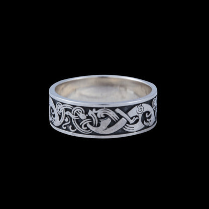 CetteBague en argent massif capture cette période artistique avec un design qui entrelace les corbeaux emblématiques d'Odin.