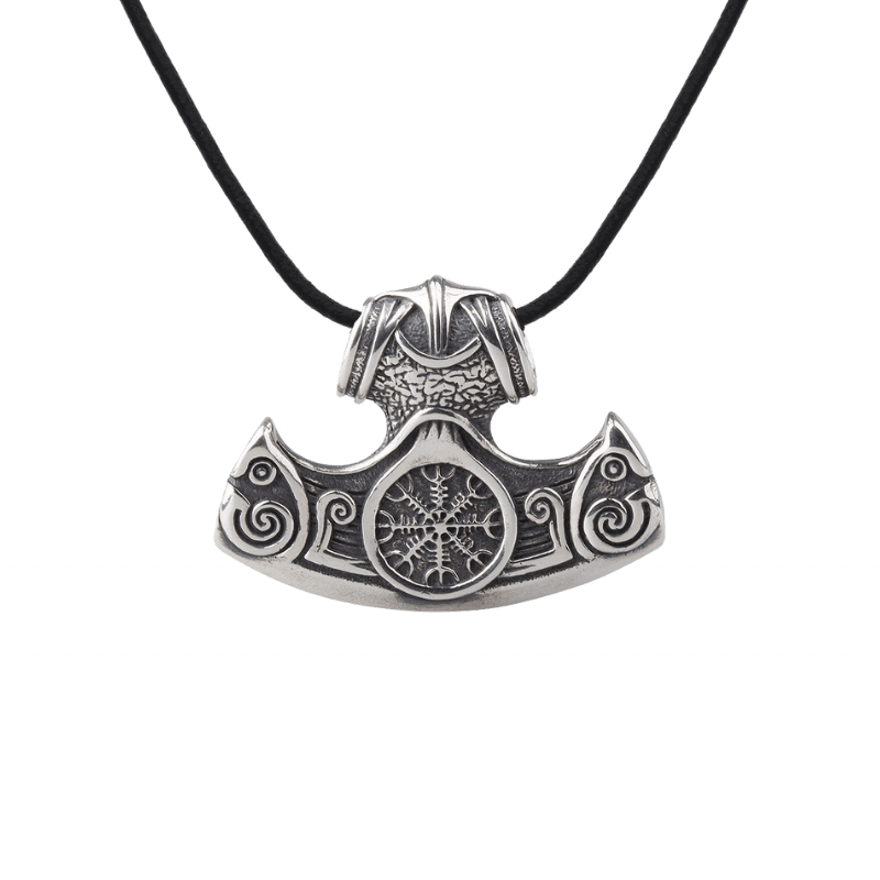 Ce pendentif mélange magistralement ces deux symboles puissants, gravant l'Aegishjalmur sur Mjolnir. Son revers présente un visage nain unique, faisant référence au conte de Fafnir, faisant de cette pièce non seulement un symbole de protection et de force, mais également un porteur de riches traditions nordiques.