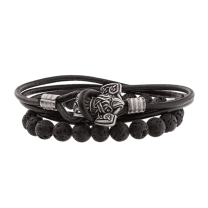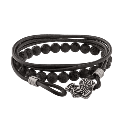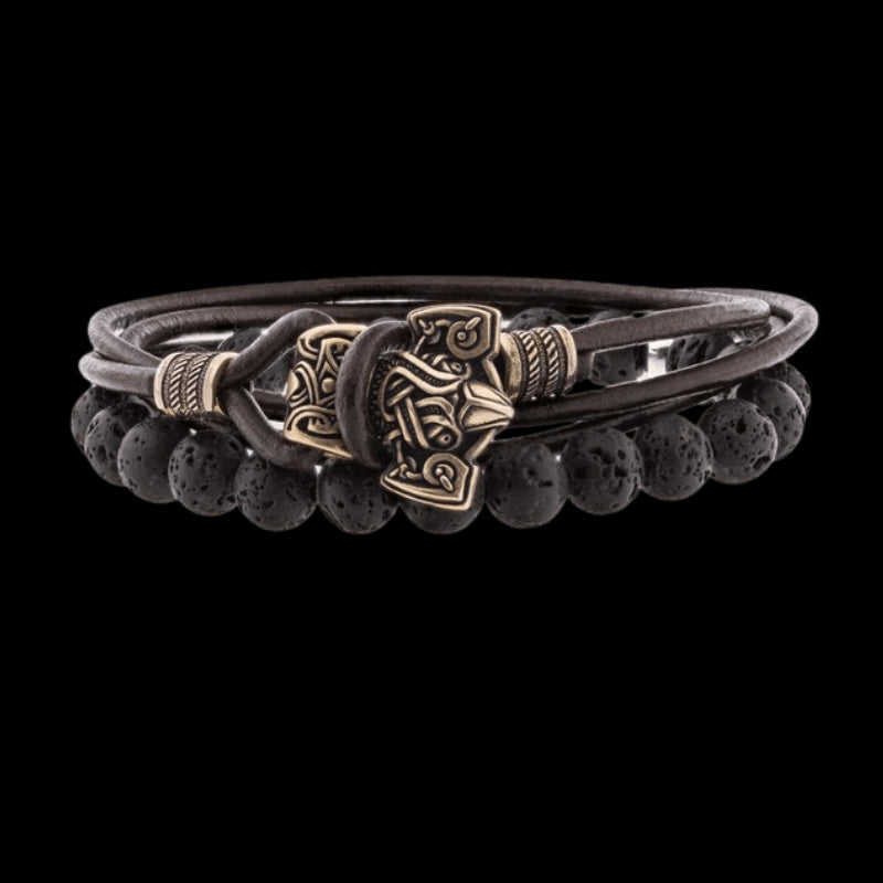Bracelet Marteau De Thor En Pierre De Lave En Cuir - Fabriqué A La Main