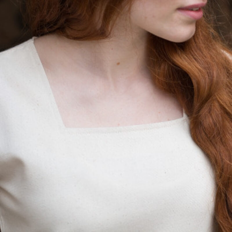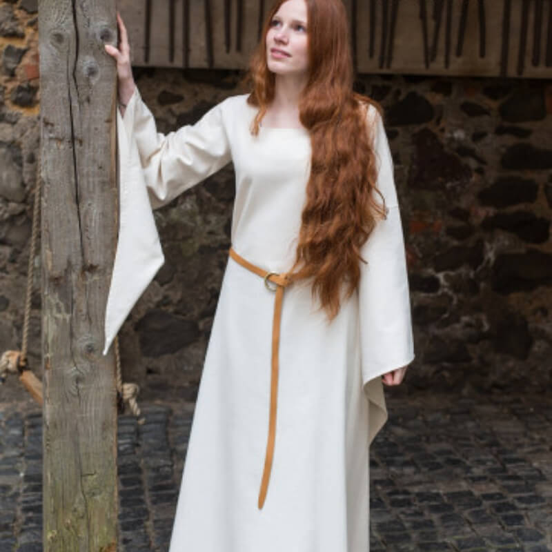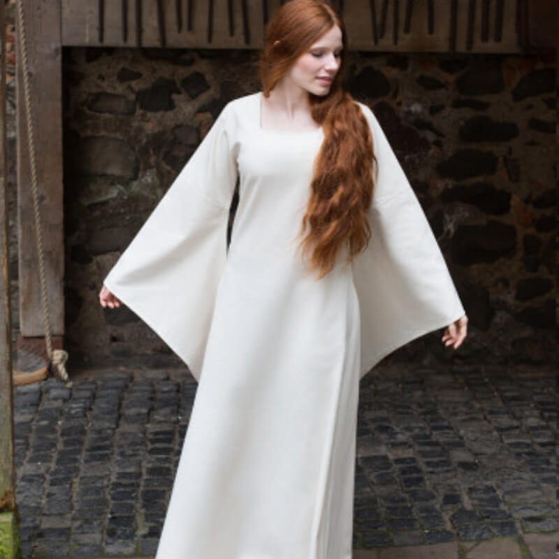 Fabriquée à partir de coton blanc naturel, cette sous-robe présente des manches trompette distinctives, souvent appelées « manches de magicien » par les amateurs de fantaisie et de GN.