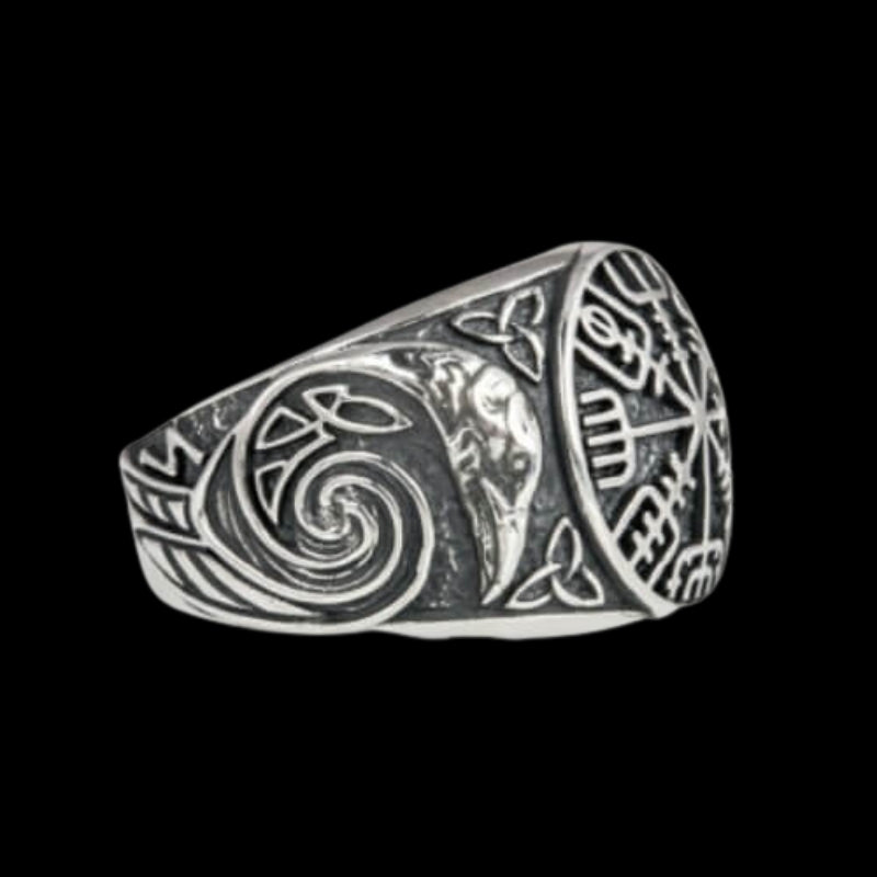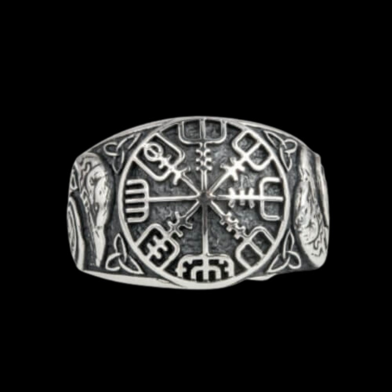 Bague Vegvisir Orné De Corbeaux Fabriquée A La Main En Argent