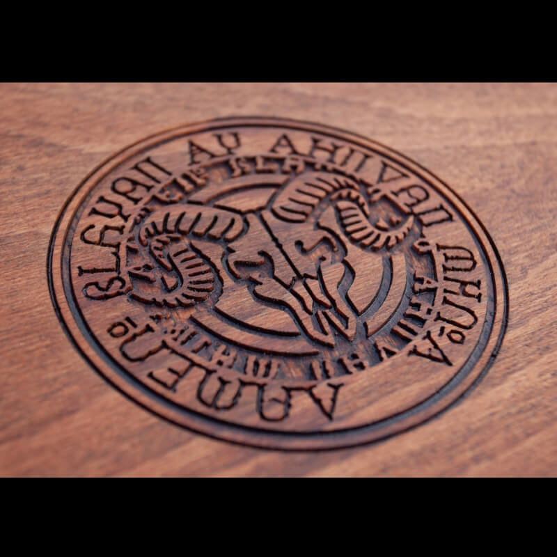 La gravure profonde sur le dessus de la boîte, rehaussée par le traitement à l'huile de bois, ajoute une touche artistique viking.