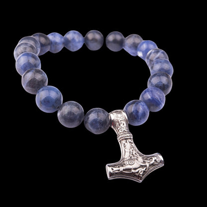 Canalizza l'antica saggezza e la forza degli dei nordici con questo braccialetto vichingo realizzato a mano. L'iconico Mjolnir, il martello di Thor, è conosciuto come un potente simbolo di protezione e forza, forgiato per difendersi dal caos. Abbinato a 23 perle di sodalite naturale, questo braccialetto cattura lo spirito vichingo di resilienza e chiarezza.