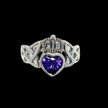 Questo anello Claddagh in argento sterling con zirconia viola cattura l'essenza della tradizione celtica infusa con un tocco di eleganza moderna. Il design distintivo del Claddagh presenta due mani che stringono un cuore, sormontato da una corona, incarnando le qualità dell'amore (cuore), dell'amicizia (mani) e della lealtà (corona).