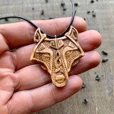 Ciondolo con testa di Fenrir in legno d'ulivo unico intagliato a mano