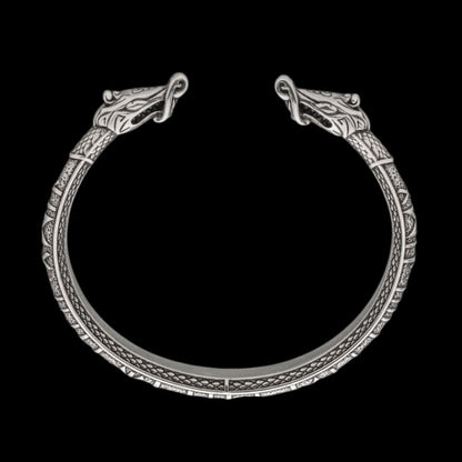 I braccialetti erano popolari nel mondo vichingo e questo design ispirato ai vichinghi è un bracciale con iscrizioni runiche che termina con due teste di drago.