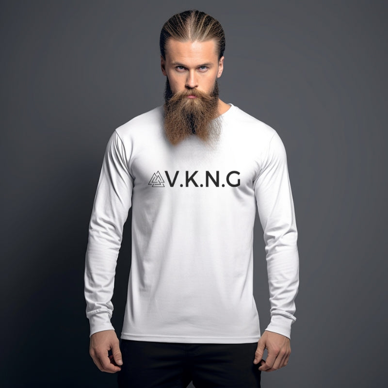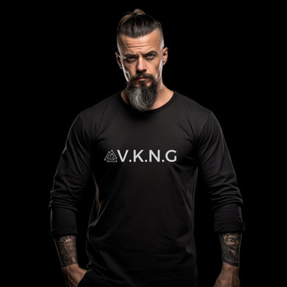 Vikingene verdsatte tapperhet og eventyrlyst, og de var stolte over å kalle seg vikinger. Her på V.K.N.G. vi deler disse verdiene mot, risikotaking og selvtillit. Denne t-skjorten feirer disse verdiene, med VKNG-navnet og logoen på forsiden, og ordene "vær stolt" skrevet i Viking Younger Futhark-runene på baksiden av skjorten. Detaljert trykk på en høykvalitets t-skjorte, tilgjengelig i en rekke størrelser.