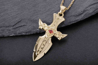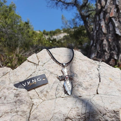 Sverdet, et æret våpen blant vikingtoktere, er mer enn bare stål og ferdighet; det er en bro til Valhall, Odins strålende hall i Åsgard. Dette fint utformede sølvanhenget er en hyllest til de legendariske norrøne sverdene, et symbol på reisen fra dødelig heltemot til guddommelig tapperhet.