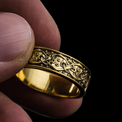 I vikingtiden prydet krigere seg med edelt metallsmykker, ikke bare som dekorative gjenstander, men som symboler på deres rikdom og kampdyktighet. Denne moderne tolkningen av en norrøn ring, dekorert i tradisjonell Viking Urnes-stil, bærer denne arven videre. Urnes-stilen, som blomstret på slutten av 1000- og begynnelsen av 1100-tallet, er kjent for sine intrikate design, der linjer elegant flettes sammen, ofte omdannes til dyreformer, og fanger essensen av vikingkunstneri og spiritualitet.