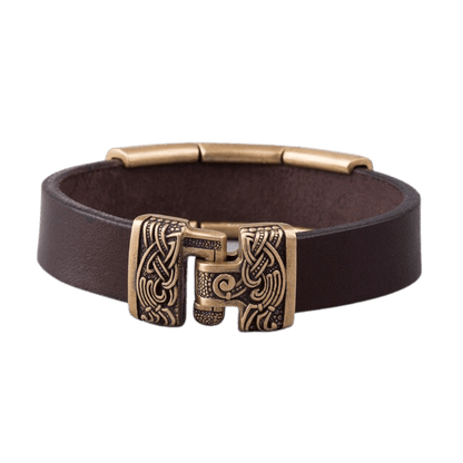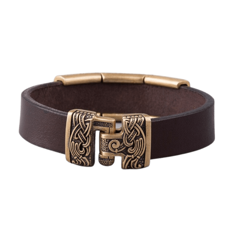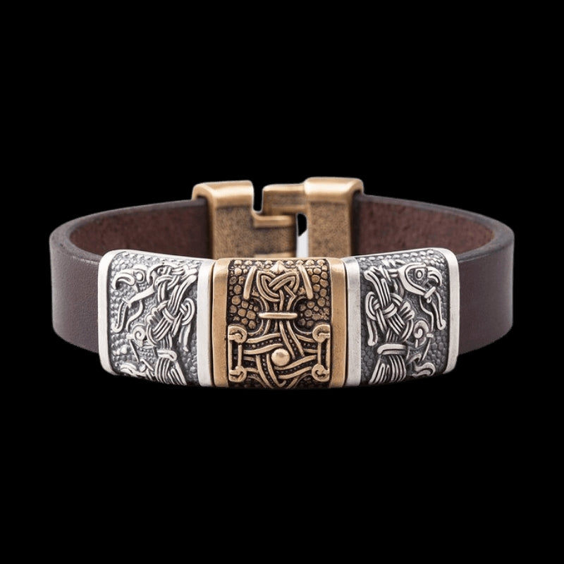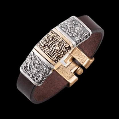 Laget av slitesterkt italiensk lær, er dette smykket pyntet med bronse- eller sølvplater med ikoniske norrøne motiver.