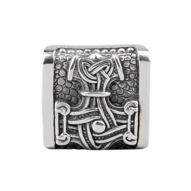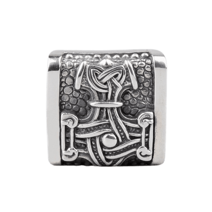 I midten ligger Mjolnir, den mektige hammeren til Thor, beskytteren av guder og mennesker. Mer enn et våpen, var Mjolnir et symbol på guddommelig styrke og en vanlig talisman blant vikinger for beskyttelse mot kaos.