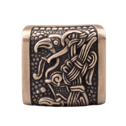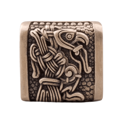 Sideplatene viser de årvåkne skikkelsene til Huginn (Tanke) og Muninn (Minne), de to ravnene til Odin. Disse hellige fuglene fløy over verden hver dag, samlet kunnskap og hvisket hemmeligheter i Allfars øre.