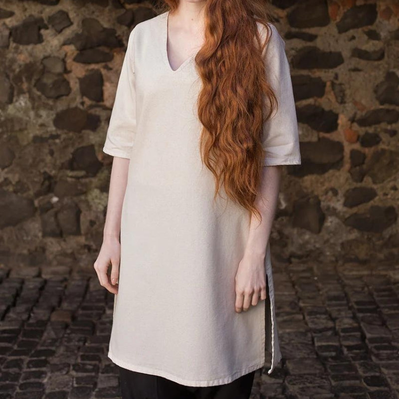 Omfavn ånden til den legendariske skjoldpiken med Lagertha Under Tunic, designet for vikingkvinner som verdsetter både stil og praktisk. Denne tunikaen har korte ermer og sjenerøse sidespalter, noe som gir bevegelsesfriheten som er avgjørende for enhver kriger. Laget av 100 % bomull, sikrer den komfort og pusteevne, perfekt for å ha på seg under en tunika under intense kamper eller livlige sammenkomster.
