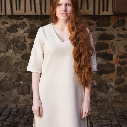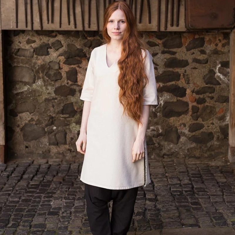 Inspirert av Lagertha, en voldsom kriger nevnt i den niende boken av Gesta Danorum av Saxo Grammaticus, hyller denne tunikaen de mektige kvinnene i norrøn mytologi. Selv om konseptet med skjoldpiken kan være forankret i legende, kan det i dag bringes til live med letthet. Kombiner denne under-tunikaen med bukser og winingas, fullfør looken med en matchende over-tunika, og legg til tilbehør som passer din smak.
