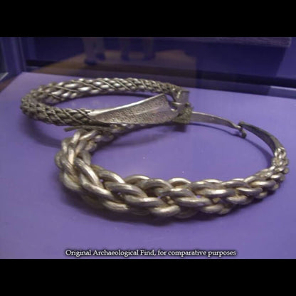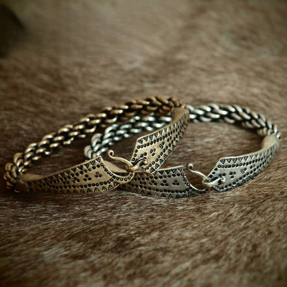 W przeciwieństwie do nowoczesnych metod odlewania, ten element jest starannie wykonany ręcznie z kilku skręconych drutów z brązu, przyspawanych do końcówek, które spłaszczają się, tworząc zamknięcie lub zapięcie. Zapięcia te ozdobione są geometrycznymi, wytłoczonymi motywami, przypominającymi legendarne nordyckie rzemiosło, które celebrowało zarówno piękno, jak i bestię.