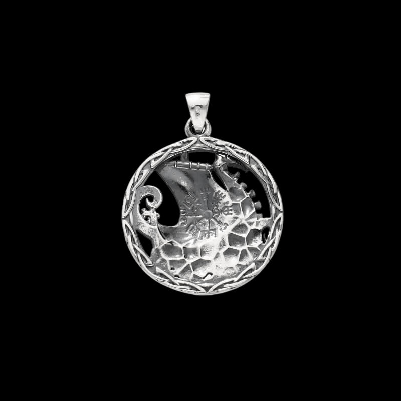 Ten wisiorek ze srebra sterlingowego uchwyca istotę ducha wikinga żeglarza. Wzdłuż jego tarcz znajdują się niektóre z najpotężniejszych symboli nordyckich: