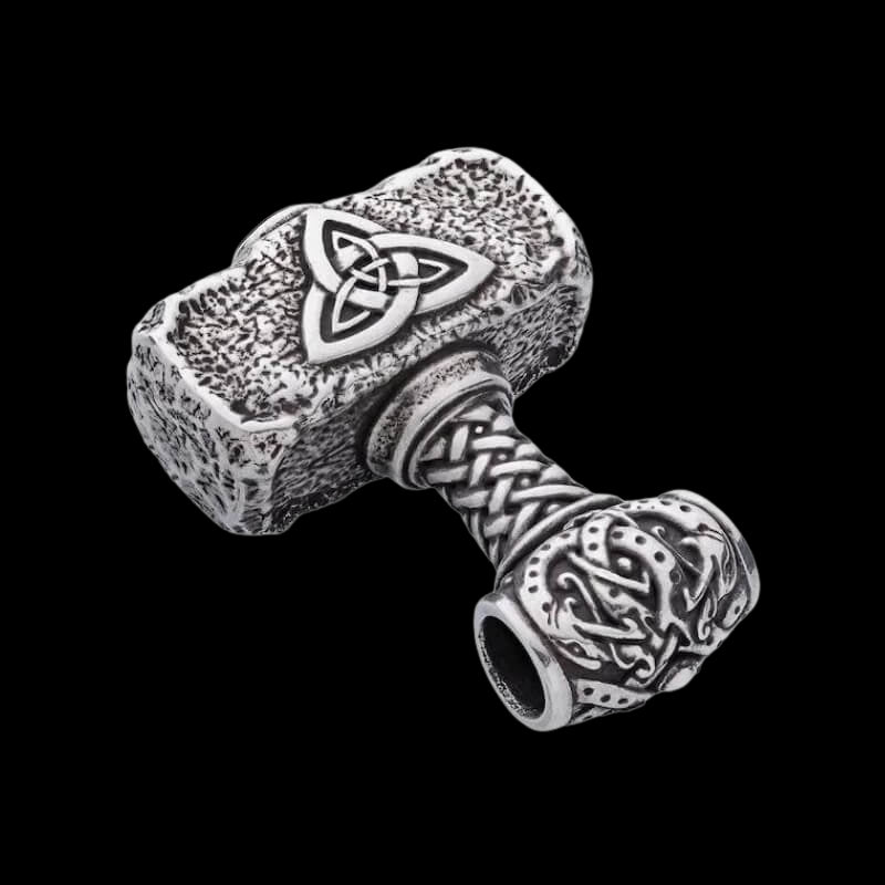 Wejdź do świata mitologii nordyckiej z „Ręcznie wykonanym srebrnym wisiorkiem ogromnego Mjolnira Valknut Triquetra Thora”, symbolem mocy i ochrony.