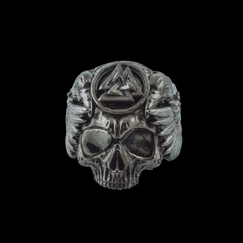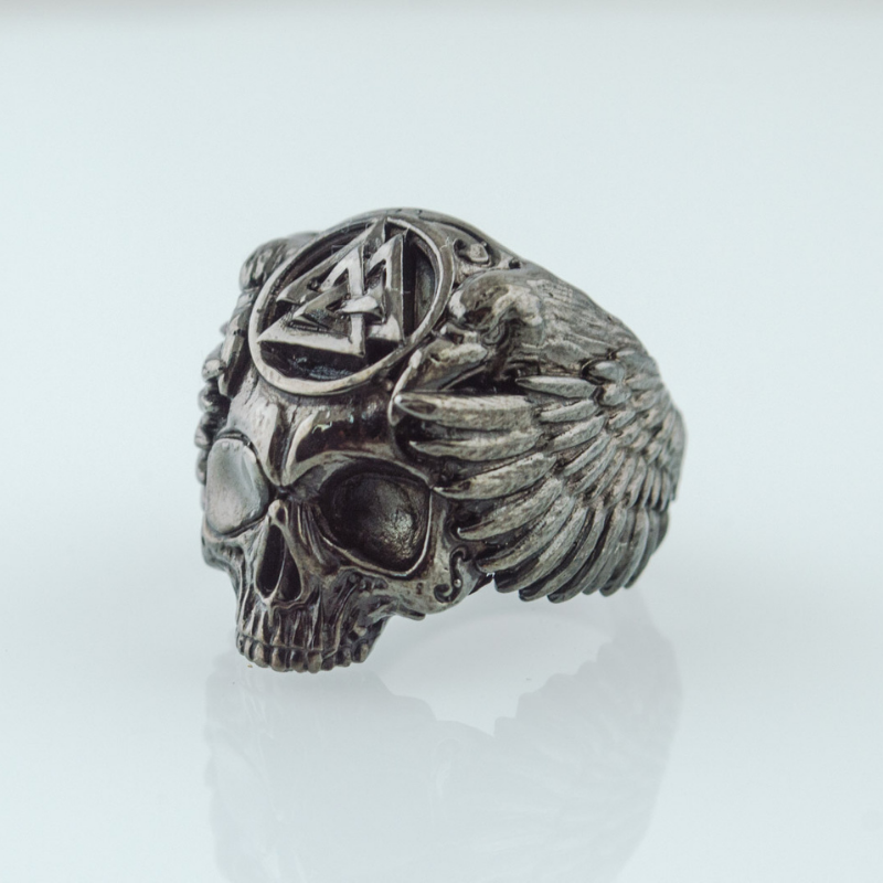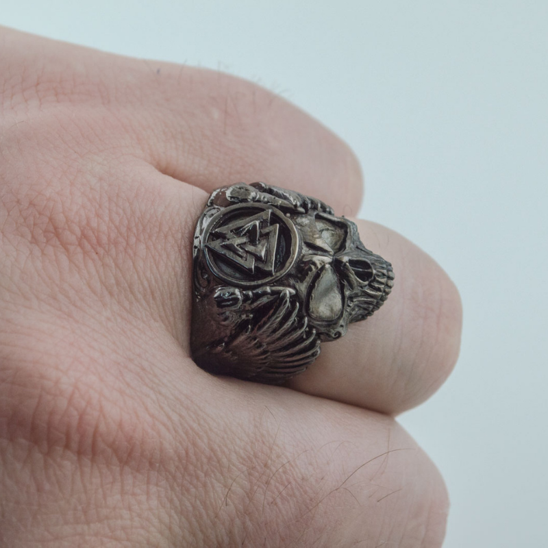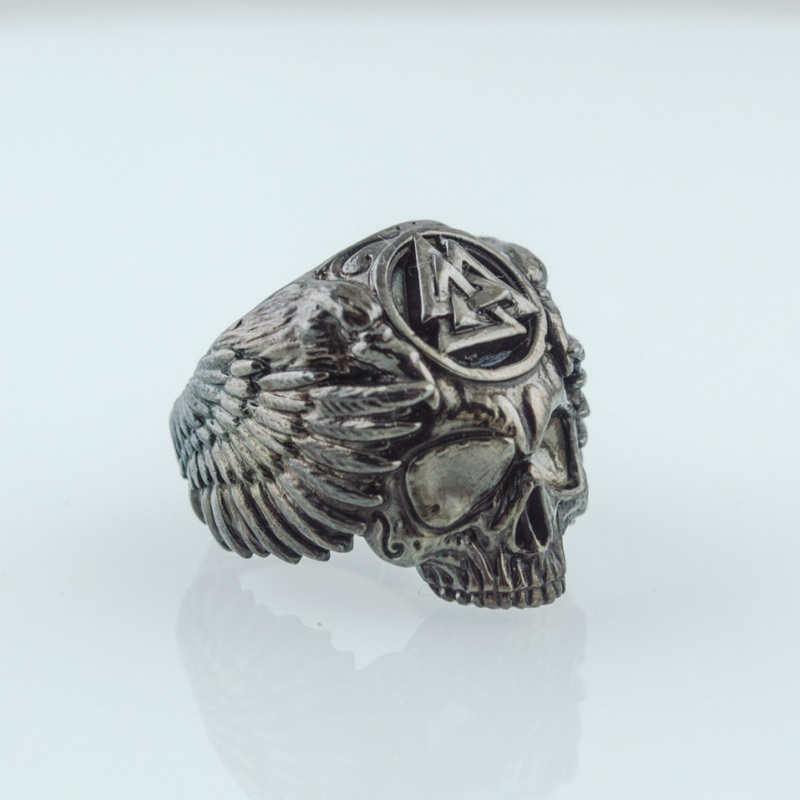 Ręcznie wykonany srebrny pierścionek z czaszką Odyna i orzechem Valknut, pokryty rutenem
