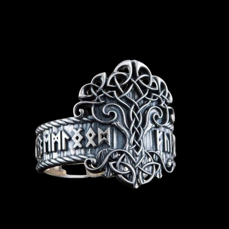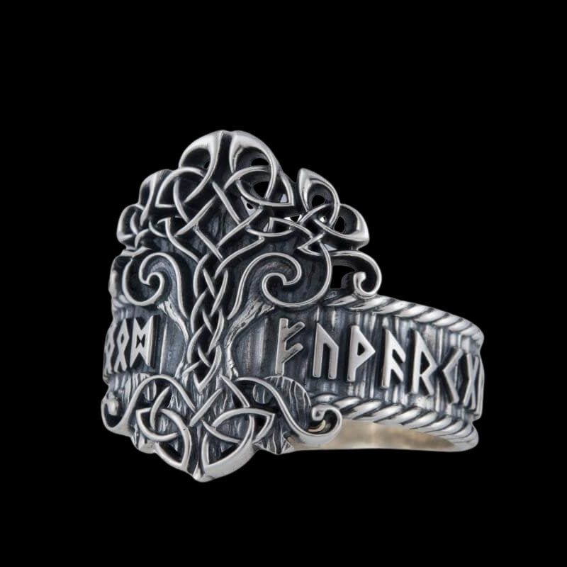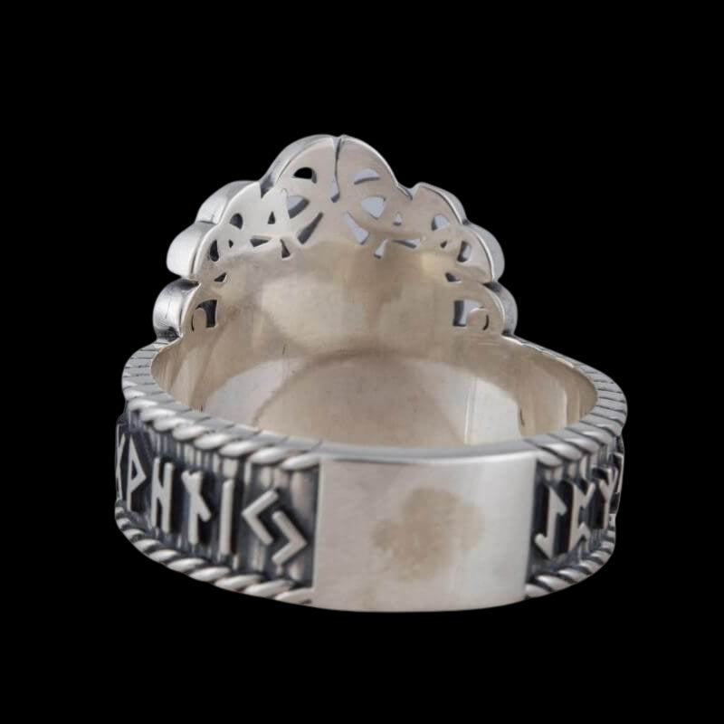 Ręcznie wykonany srebrny pierścionek z symbolem Yggdrasil i runami nordyckimi