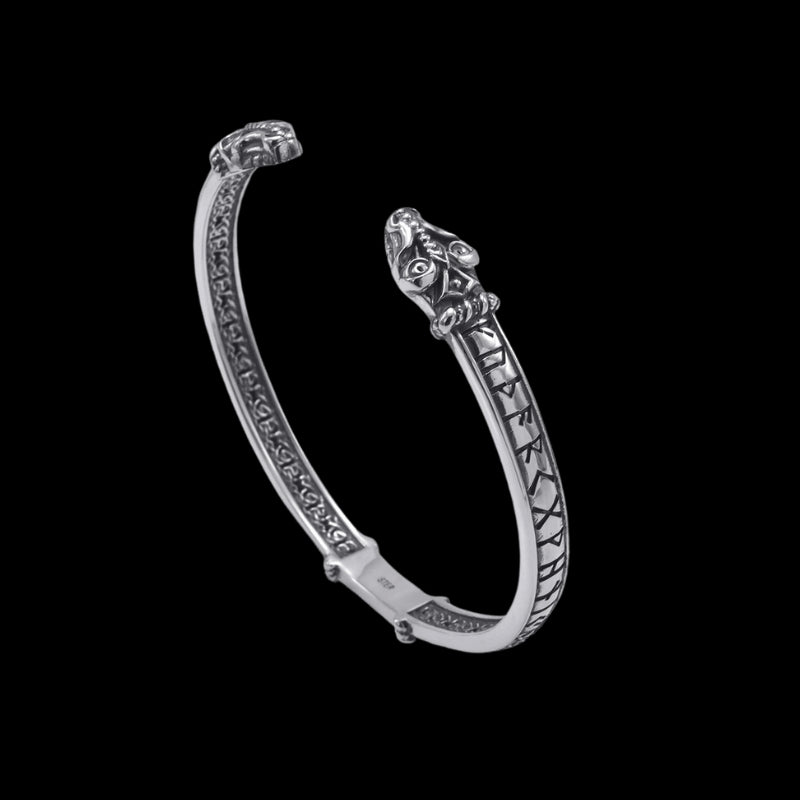 This stunning sterling silver arm ring featuring two heads of Jormungandr and the Viking runes is perfect for anyone who believes in controlling their own destiny.