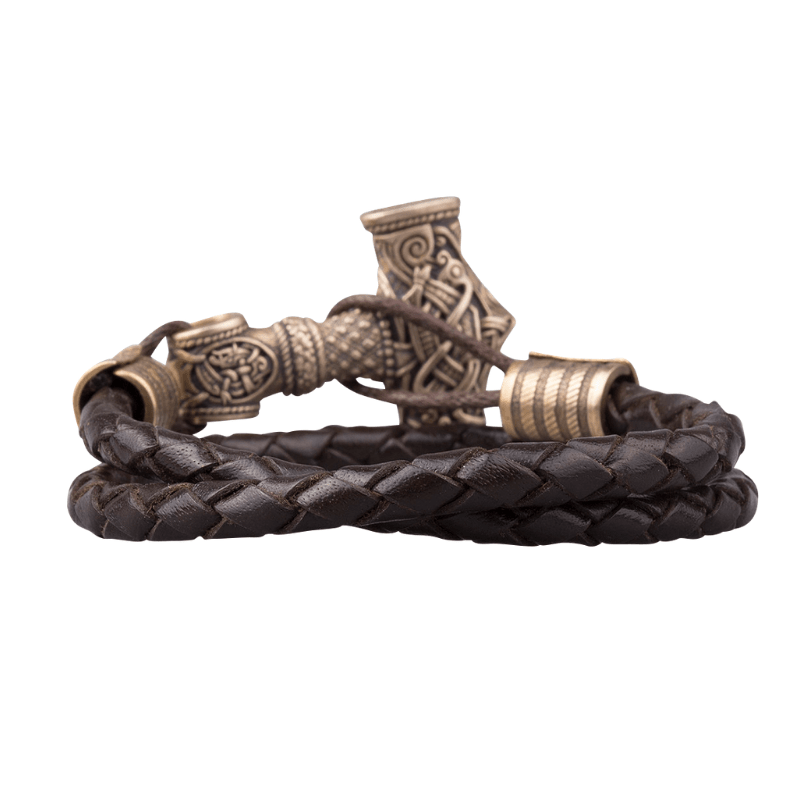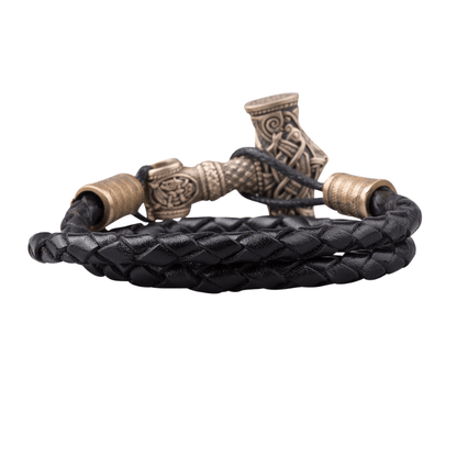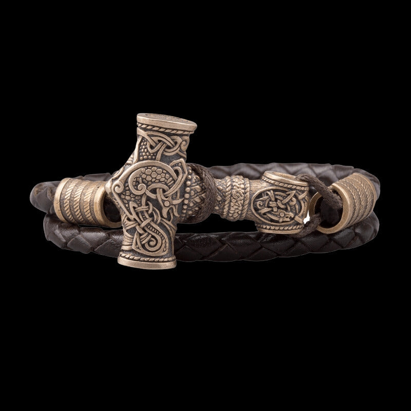 Channel the might of the Norse gods with this Large Thor Hammer Bronze Leather Bracelet.