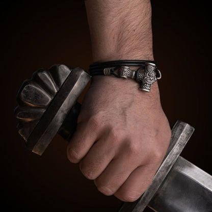 Crafted with a braided leather cord designed to encircle the wrist, this bracelet is not just a stylish accessory but a symbol of power and protection.