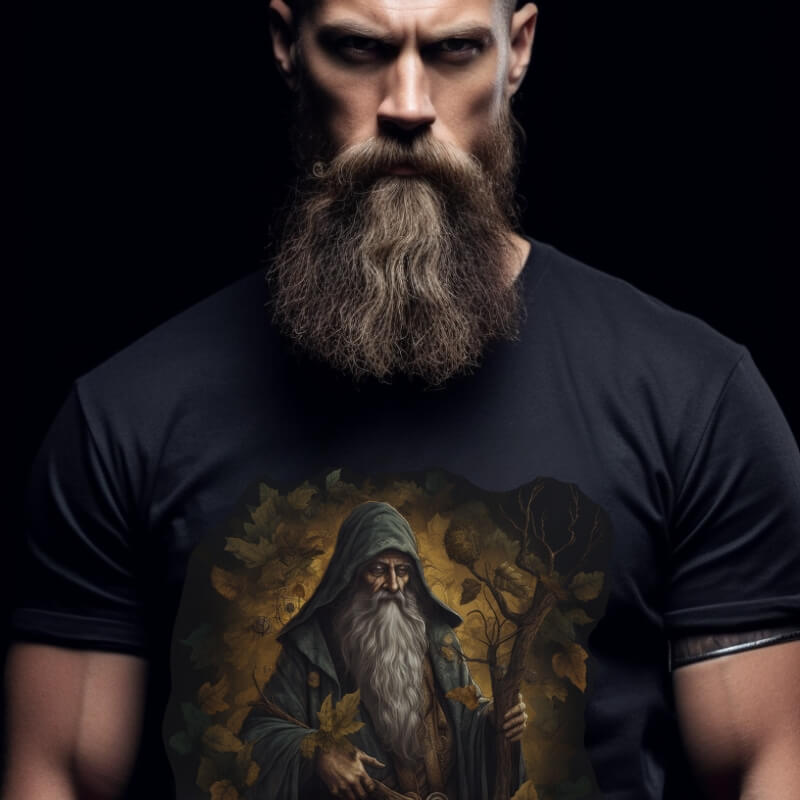 Immerse yourself in the mystical world of Norse mythology with the Druid V3 V.K.N.G™ T-Shirt. This garment features a serene and wise Nordic druid, an embodiment of ancient wisdom and a profound connection to nature. Dressed in a robe adorned with intricate patterns, the druid stands in a mystical forest, a setting that signifies his deep bond with the natural world and ancient spirits.